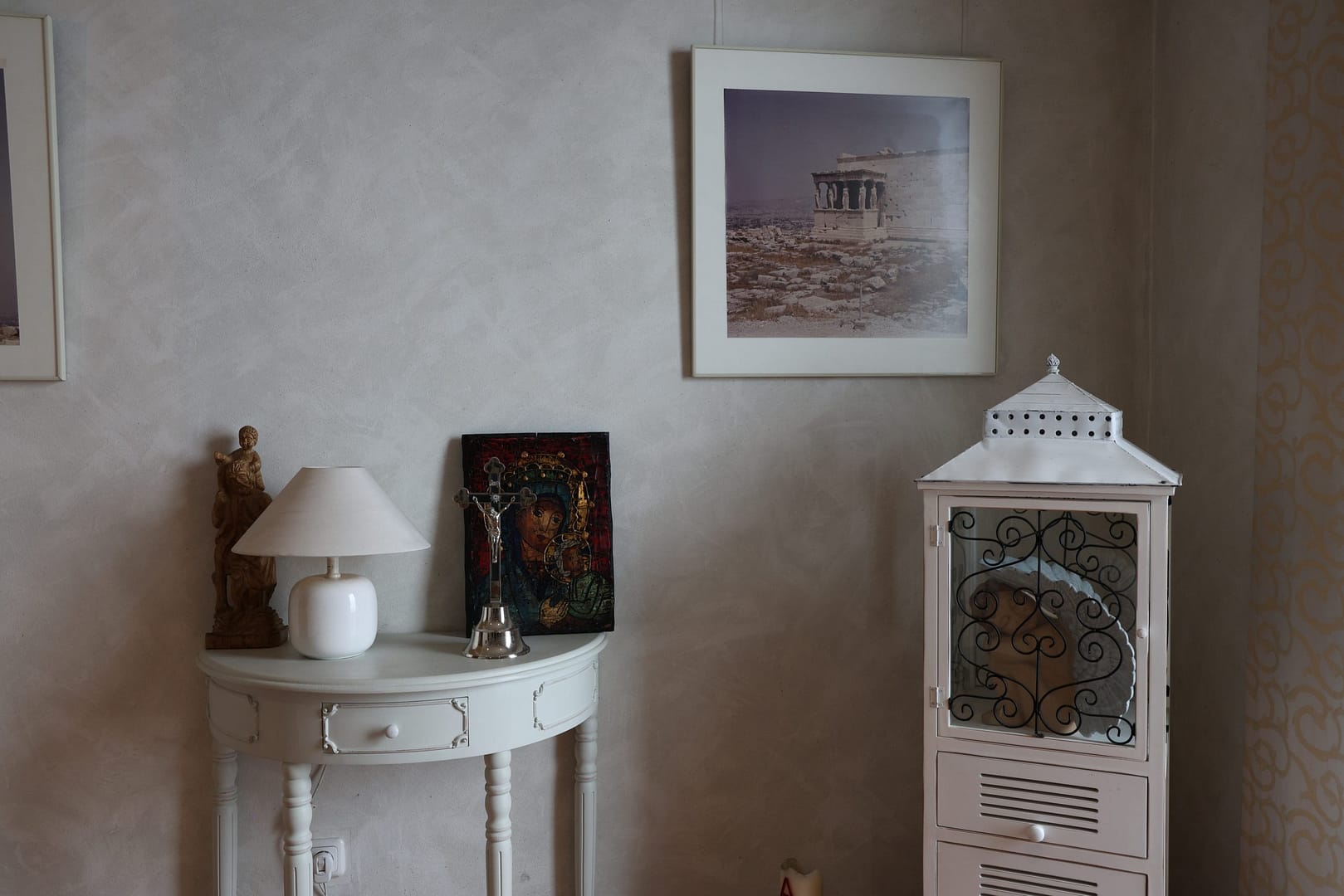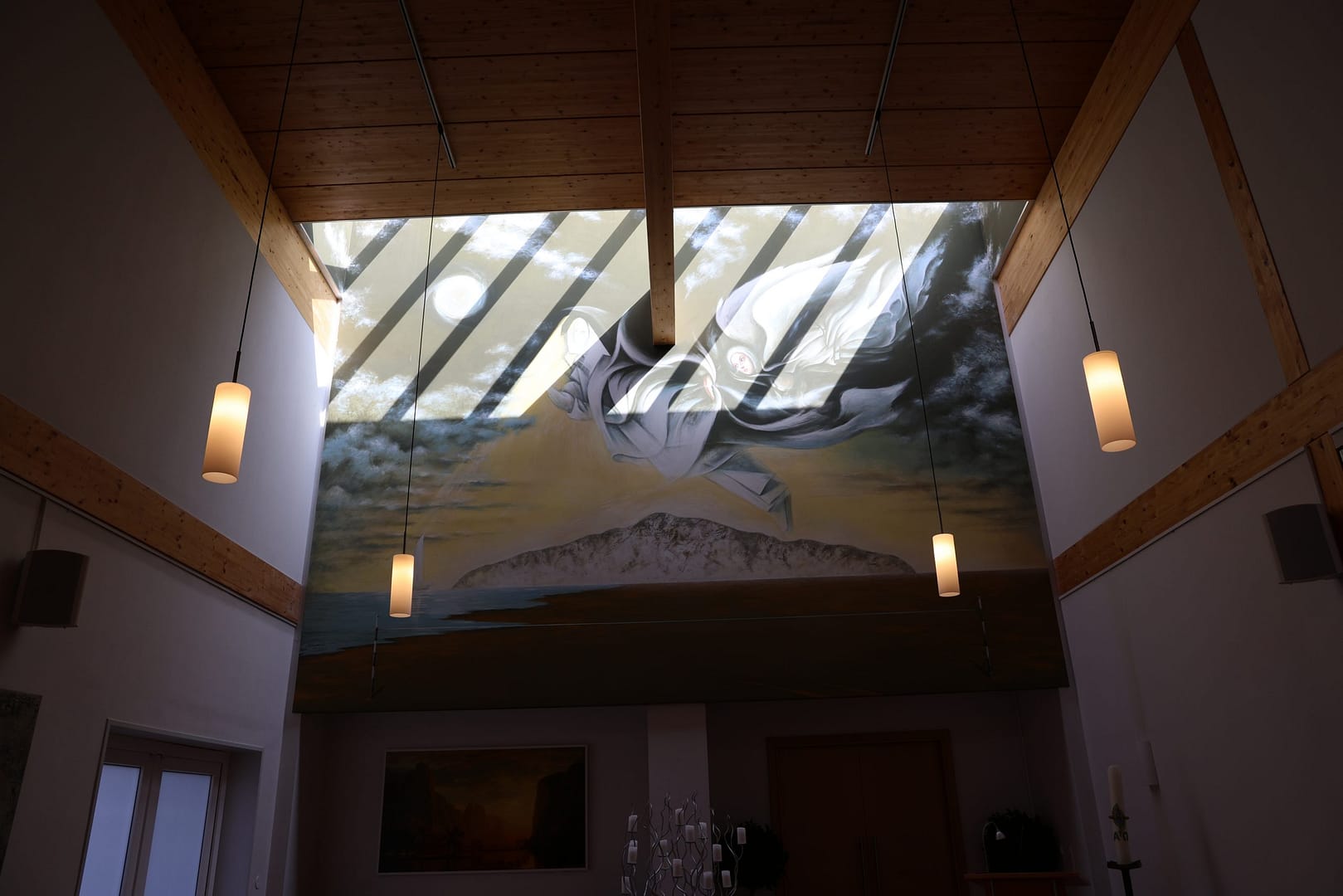 Prägend für die Atmosphäre ist das eindrucksvolle Fresko des Künstlers Victor Tschumakov: Ein Engel begleitet behutsam eine Seele über den Fluss Styx, ein Bild des Übergangs, das dem Raum Tiefe und Trost verleiht.
