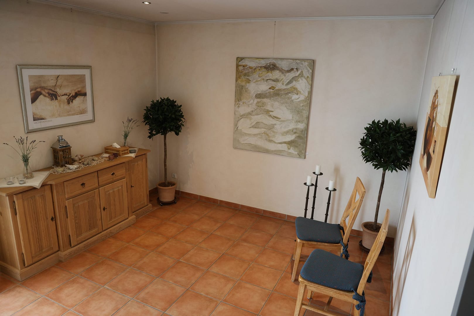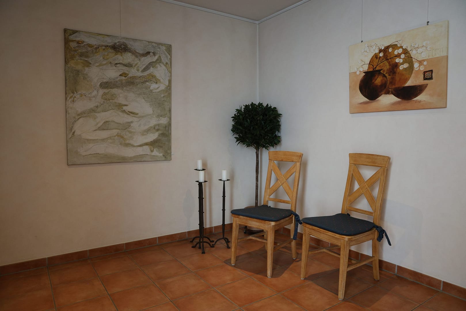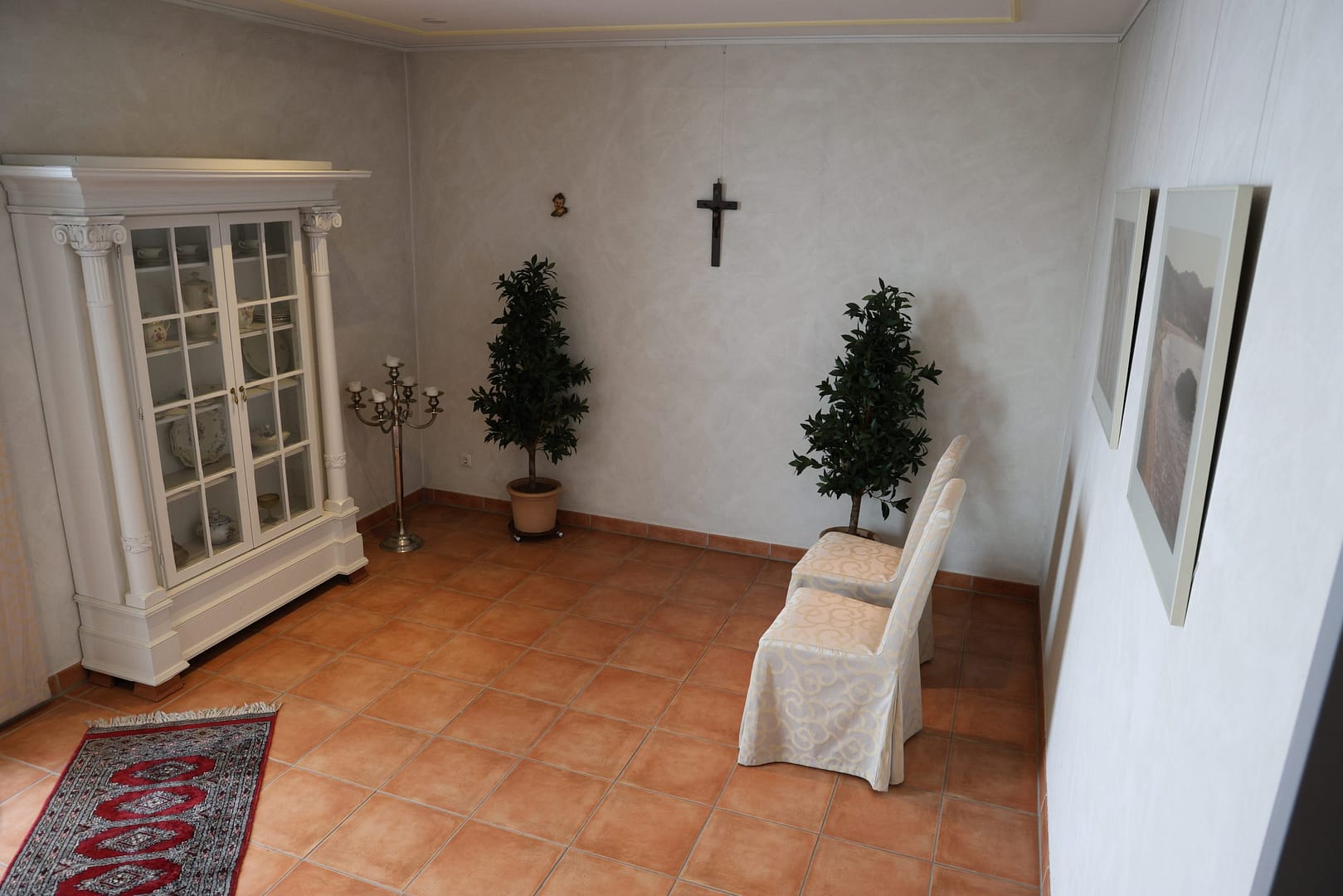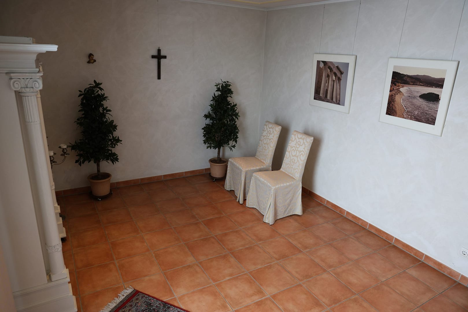 Das Stilzimmer empfängt mit klarer, schlichter Eleganz. Helles, ruhiges Ambiente und eine geordnete Atmosphäre geben Halt und lassen den Moment leicht werden. Hier entsteht Raum für Nähe, für ein stilles Verweilen, ein Gebet, einen letzten Blick.
